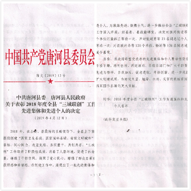 2018年,我公司緊緊圍繞創(chuàng)建“國家衛(wèi)生縣城、國家園林縣城、省級文明城市”的目標(biāo),上下一心,做好廠區(qū)環(huán)境整頓及綠化建設(shè)。獲得此項(xiàng)榮譽(yù)是縣委縣政府對我們工作的肯定。
